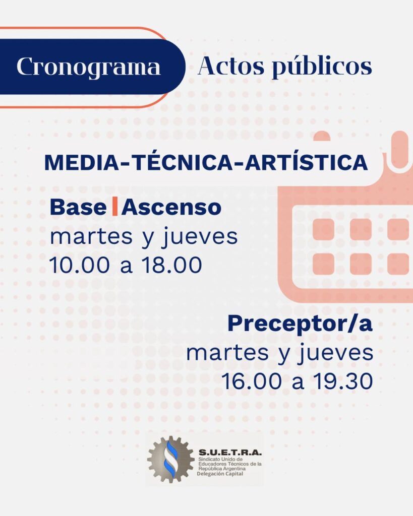 Desde SUETRA CABA, compartimos los horarios de los Actos Públicos 2026, organizados por nivel y…